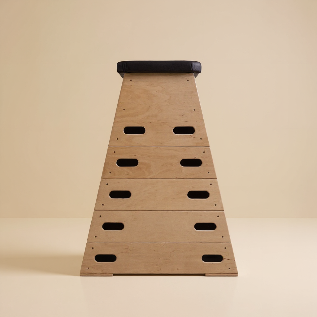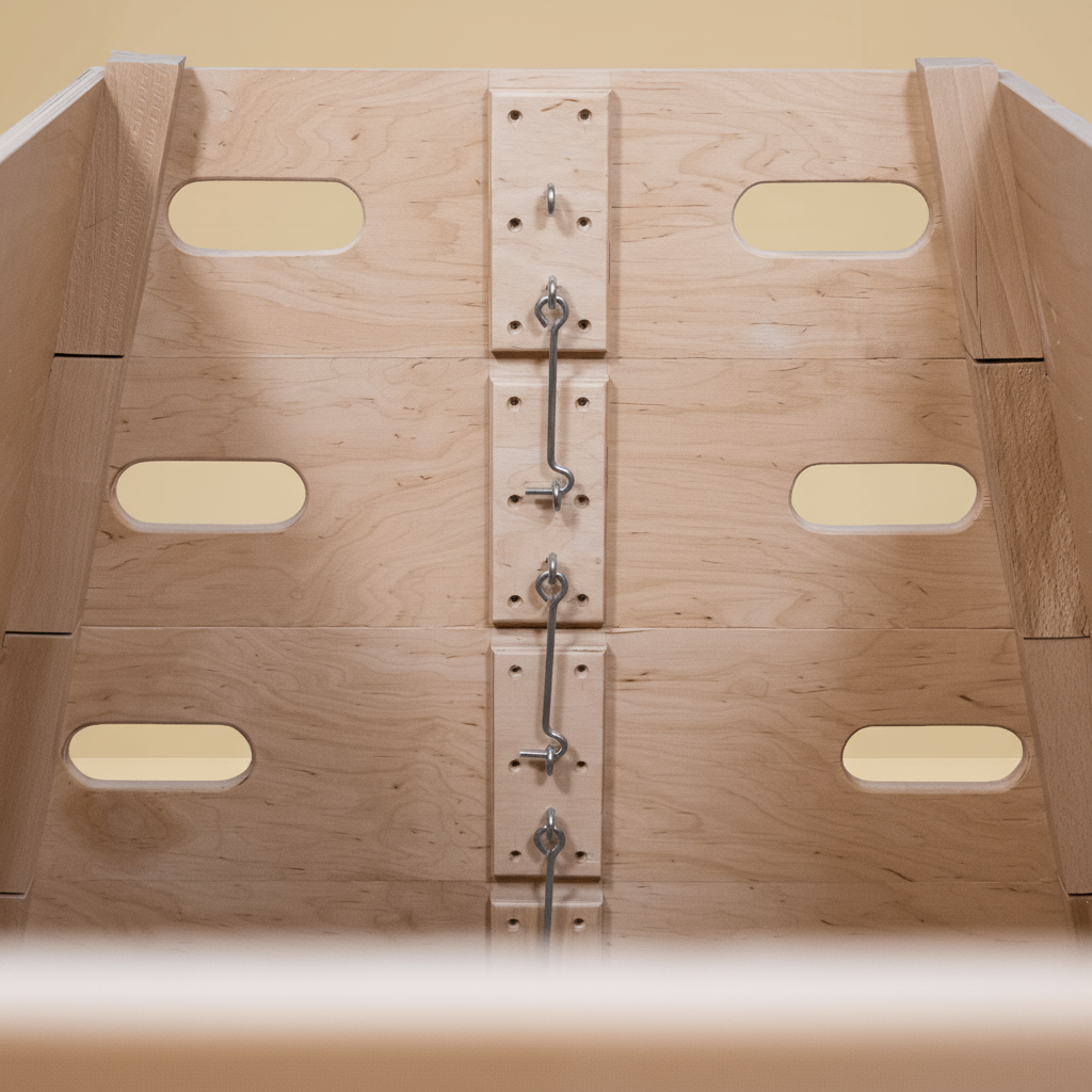 Öt egymásra illeszthető és leemelhető, csavarozással összeépített rétegelt lemez kávából áll. A legfelső elemre a homlok felületen csavarozással faforgácslap van erősítve és párnázott műbőrrel van bevonva. A talppapucsok a jobb tapadás céljából - vastag gumi alátéttel vannak ellátva. A kávatagok sarkai 3 x 45◦-ban le vannak törve. A szilárd elmozdulás mentes összekapcsolódásuk sarok léccel, illetve tagonként 2 db német kapoccsal biztosított. A mozgathatóságot a rövid oldalon kiképzett ovális furatok (nyílások) biztosítják. A frontfelületek finoman csiszolva, és két rétegben kopásálló színtelen matt lakkal vannak szórva.