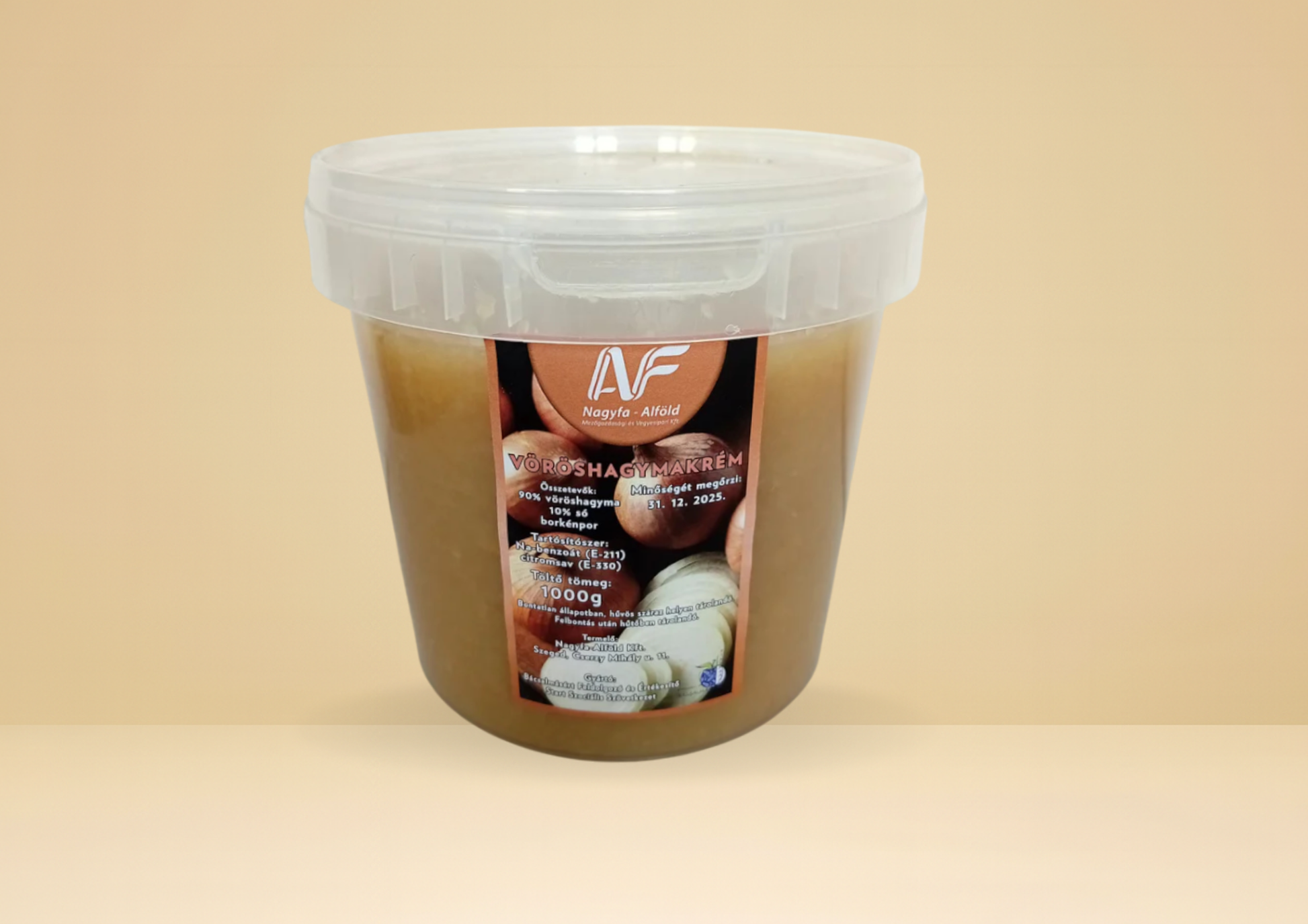 Összetevők: 90% vöröshagyma, 10% só, borkénpor. Töltőtömeg 1000 g. Tartósítószer: Na-benzoát (E-211), citromsav (E-330). Bontatlan állapotban, hűvös helyen tárolandó. Felbontás után hűtőben tárolandó.